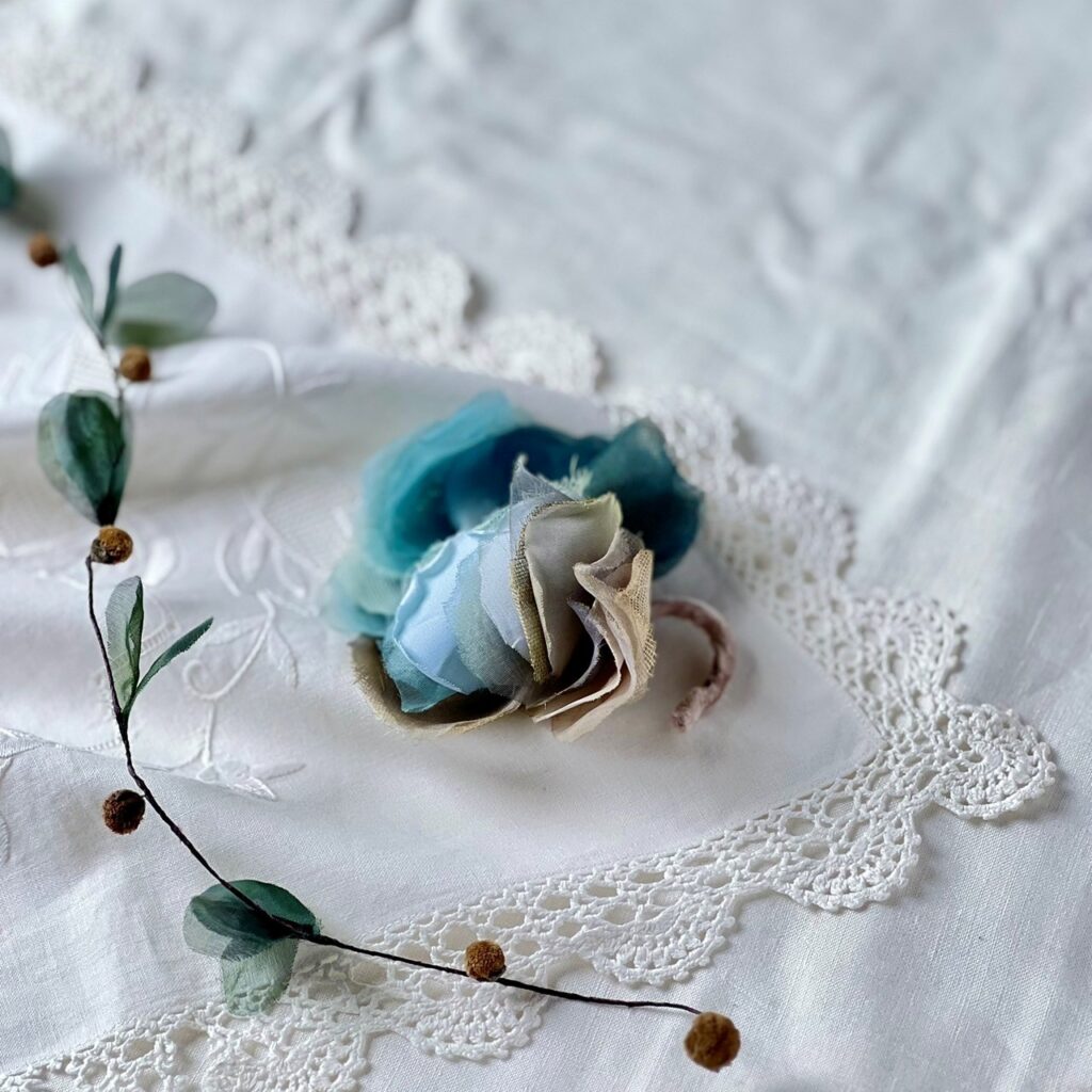 1枚の白い布を、ひとひらひとひら染色してつくる「植物」やシンプルな装いにプラスするだけで華やぐ布花アクセサリー『hicona(ヒコナ)』