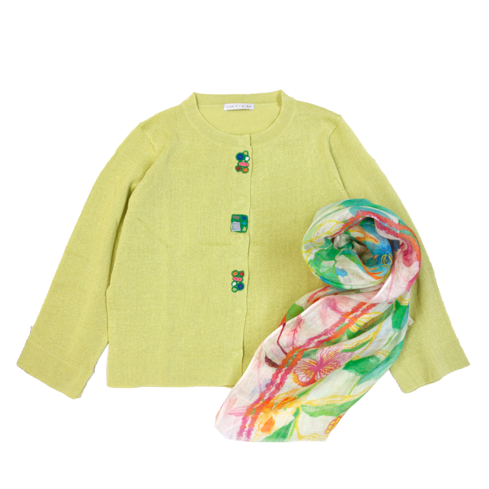 花をモチーフとした編地や、刺繍を施した綿素材のカラフルなニットウェアをはじめ、