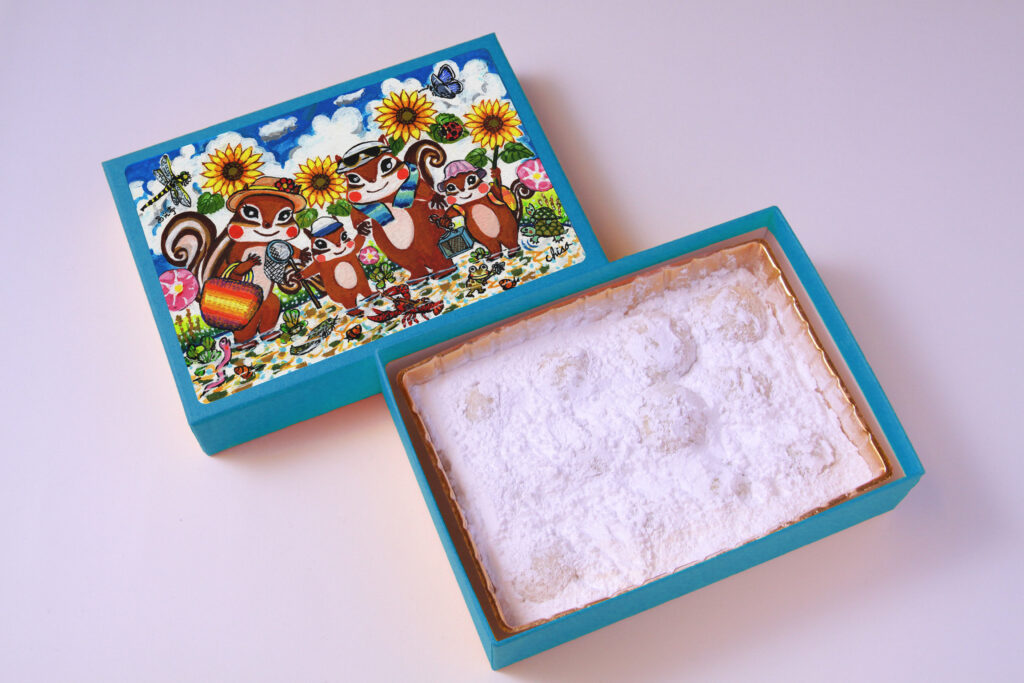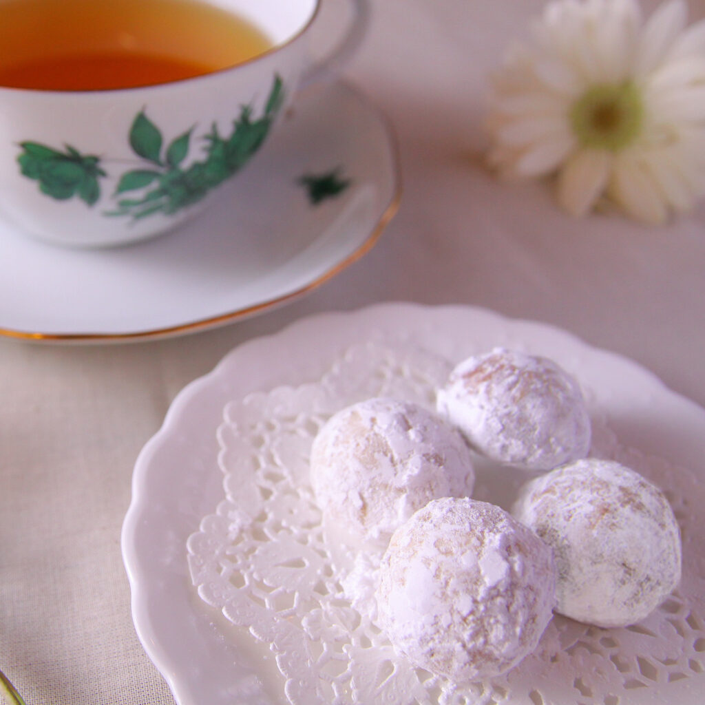真っ白い粉糖に包まれた上品なお菓子。一番の人気商品です。