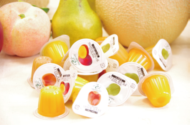 小さなカップに入った果汁、果肉をプリンとゼリーに詰め合わせました。