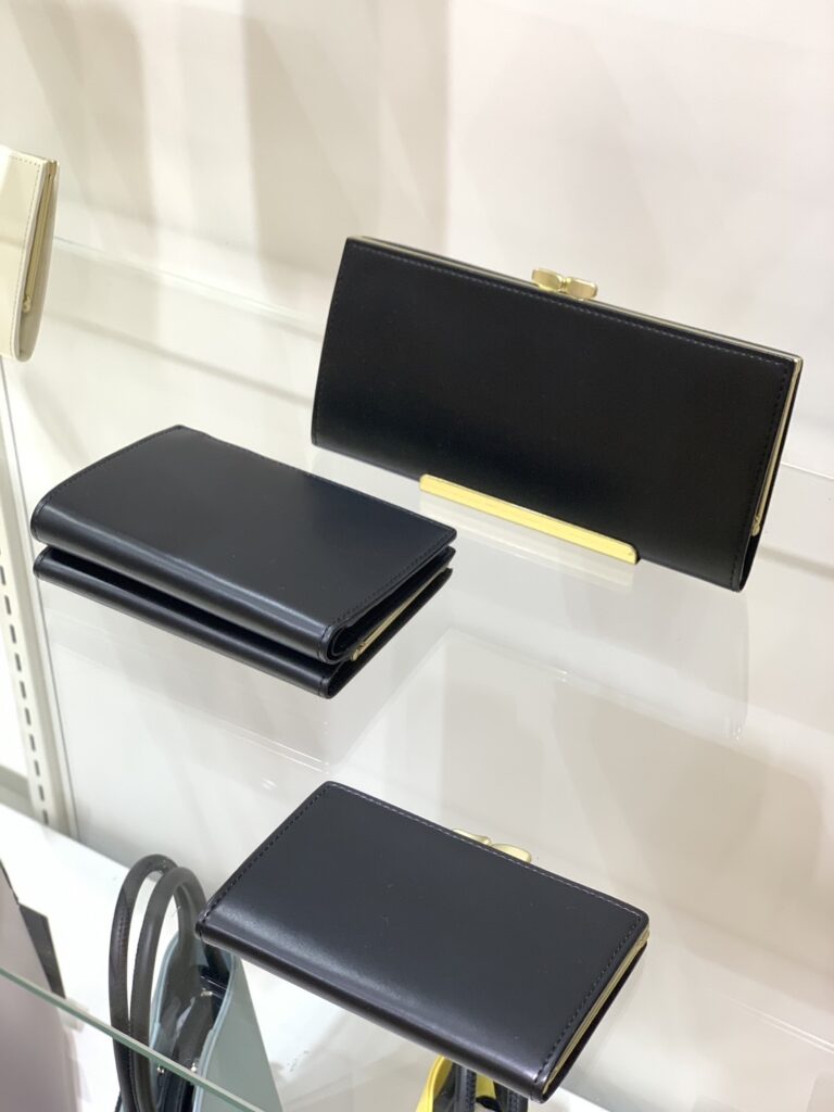 質の良いガラスレザーと、マットゴールドのメタルによってモードな印象に仕上げた口金のシリーズ。