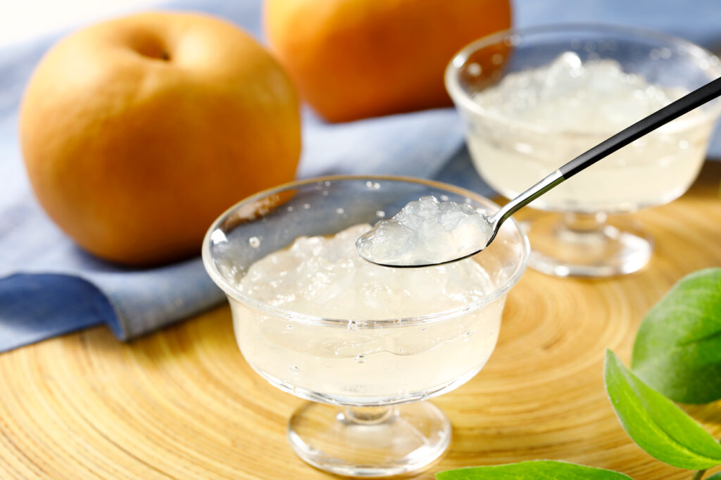 梨特有のシャリシャリ感を存分に味わえる、梨のピューレでつくった柔らかめのゼリーです。梨のさっぱりとした甘みと瑞々しさをご堪能いただけます。