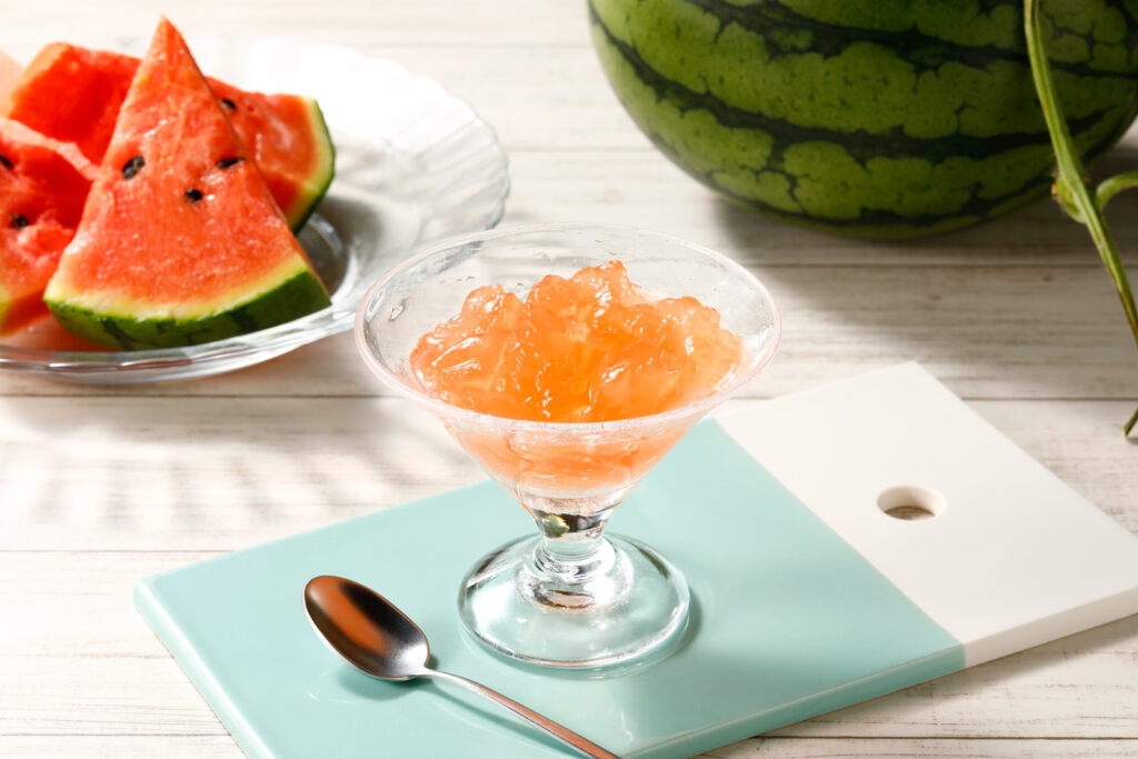 千葉県富里市で採れた”富里スイカ”のピューレを使用し、ほぐれるような食感で、酸味と甘味のバランスの良いゼリーに仕上げました。