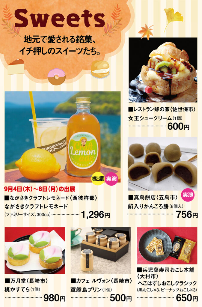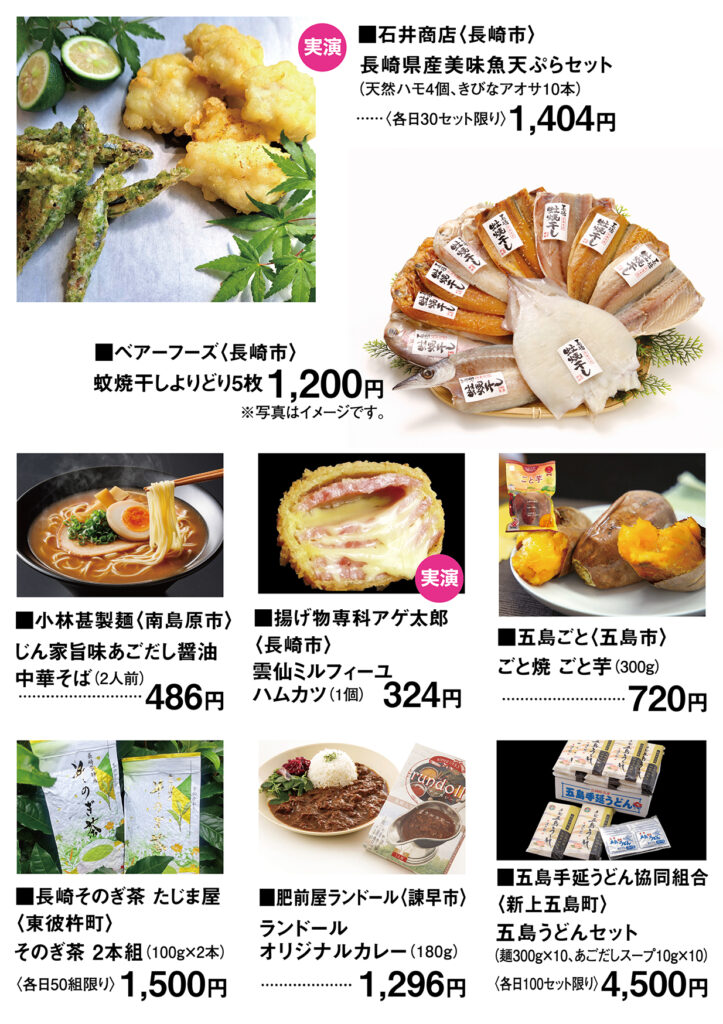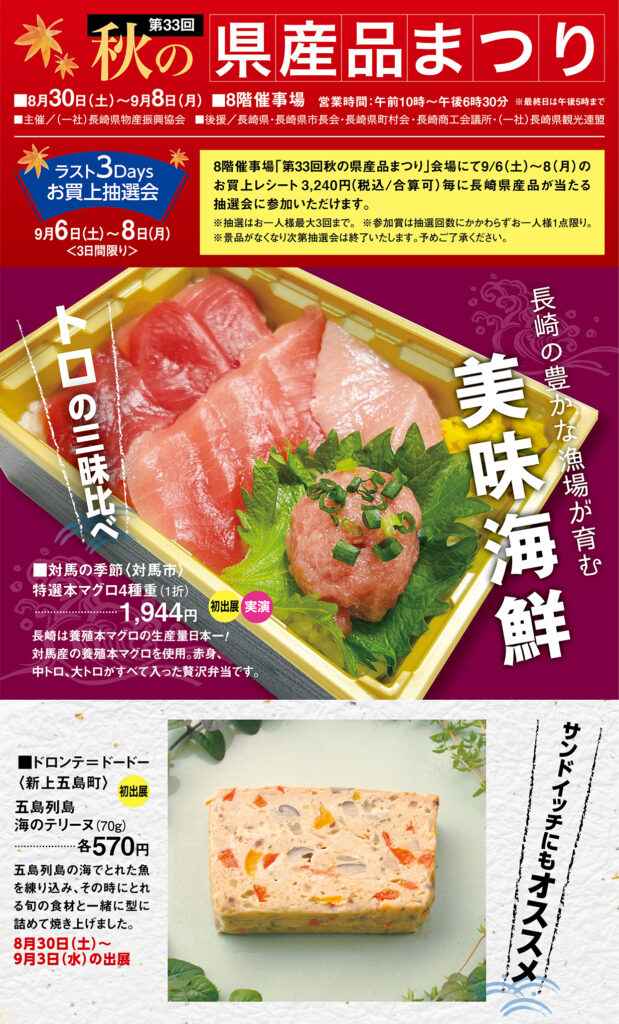 毎年大好評!秋の県産品まつりが今年も開催!第33回目の今回は長崎県が誇る美味しいお魚を例年以上にピックアップ!長崎のお魚の美味しさを改めて実感いただけること間違いなし!また、まだまだ残暑が厳しい今年は、ロールアイスやかき氷など冷たいスイーツで涼を取りましょう♪その他、初出展のお店や例年人気のお店も長崎の”よかもん”を取り揃えて皆様のご来店をお待ちしております!