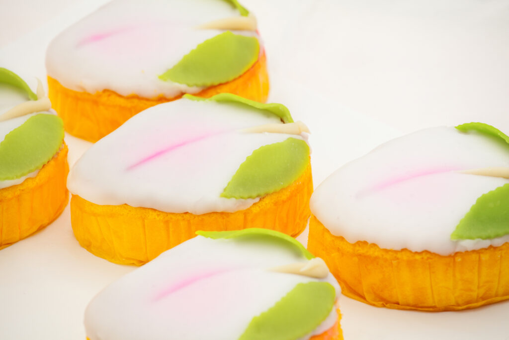 名物「桃カステラ」は、手作業で桃形のすり蜜をのせた縁起物菓子。