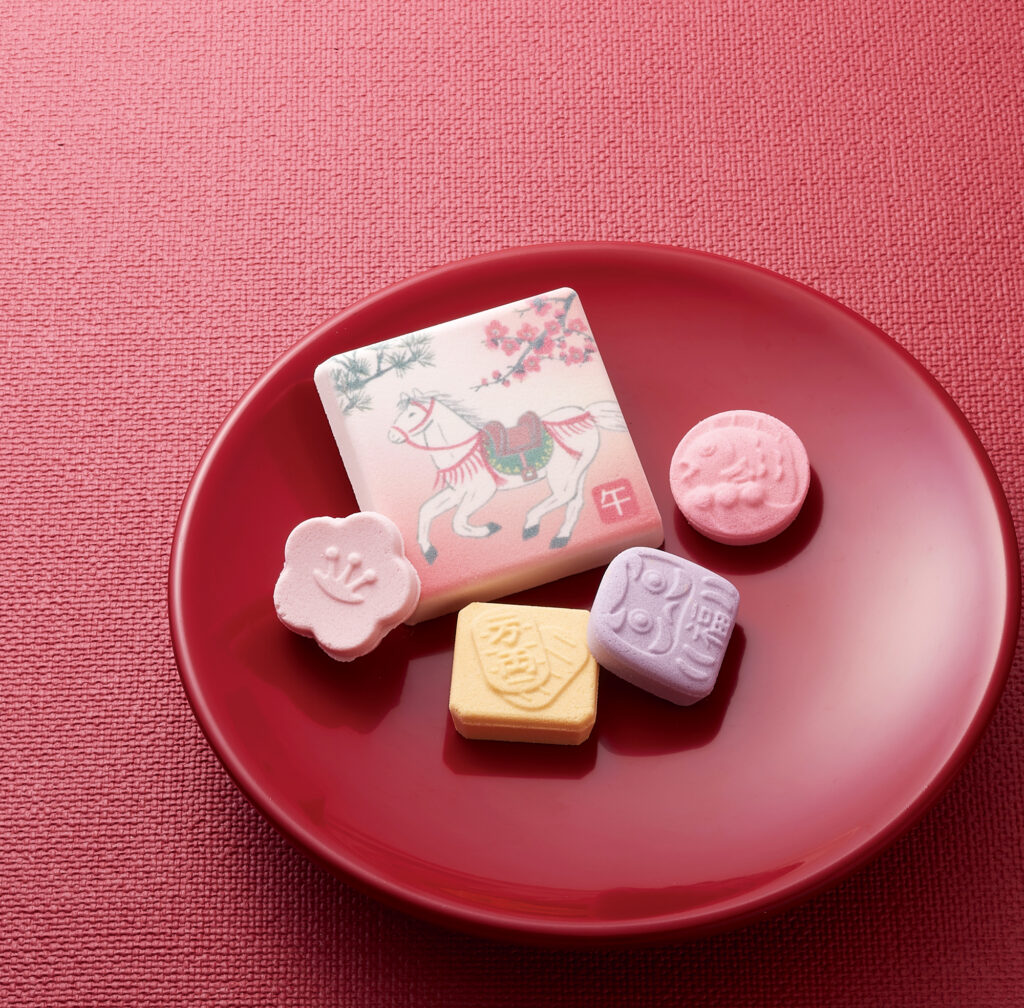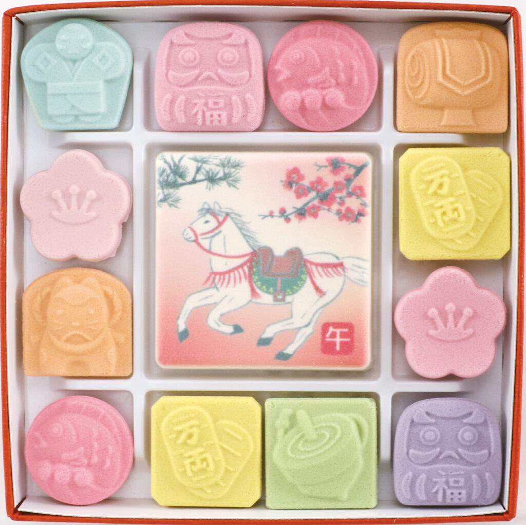 干支の午が描かれた中央の大きな和三盆をはじめ、だるま、小槌、梅の花等、新しい年の始まりを華やかに彩る季節限定商品です。