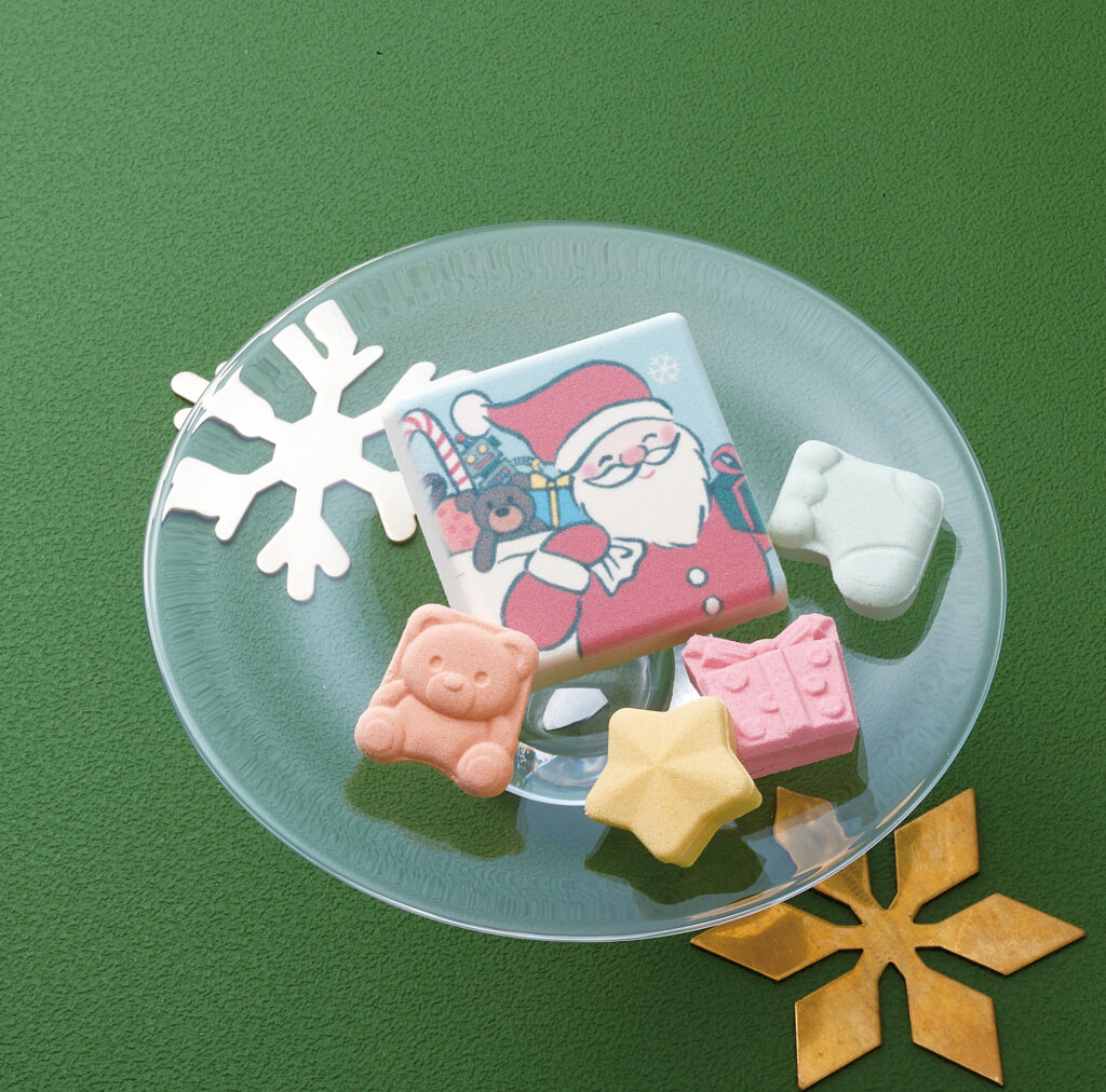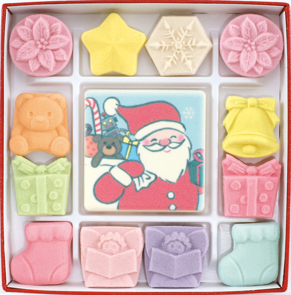 サンタさんが描かれた中央の大きな和三盆をはじめ、たくさんのクリスマスモチーフの和三盆たちが賑やかに迎えてくれるひと箱です。和三盆の優しい味わいをクリスマスの贈り物にいかがでしょうか。