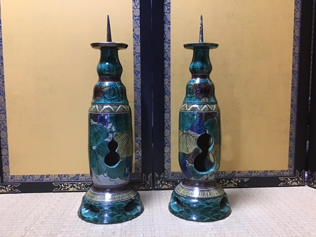 青手瓢文 燭台1対【小野窯・江戸中期】 高さ43㎝