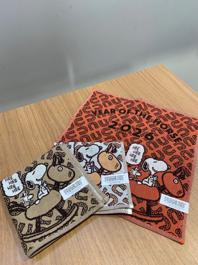 2026年のウマ年にぴったりな、馬にまたがるスヌーピーの遊び心あるデザインのガーゼハンカチです。
