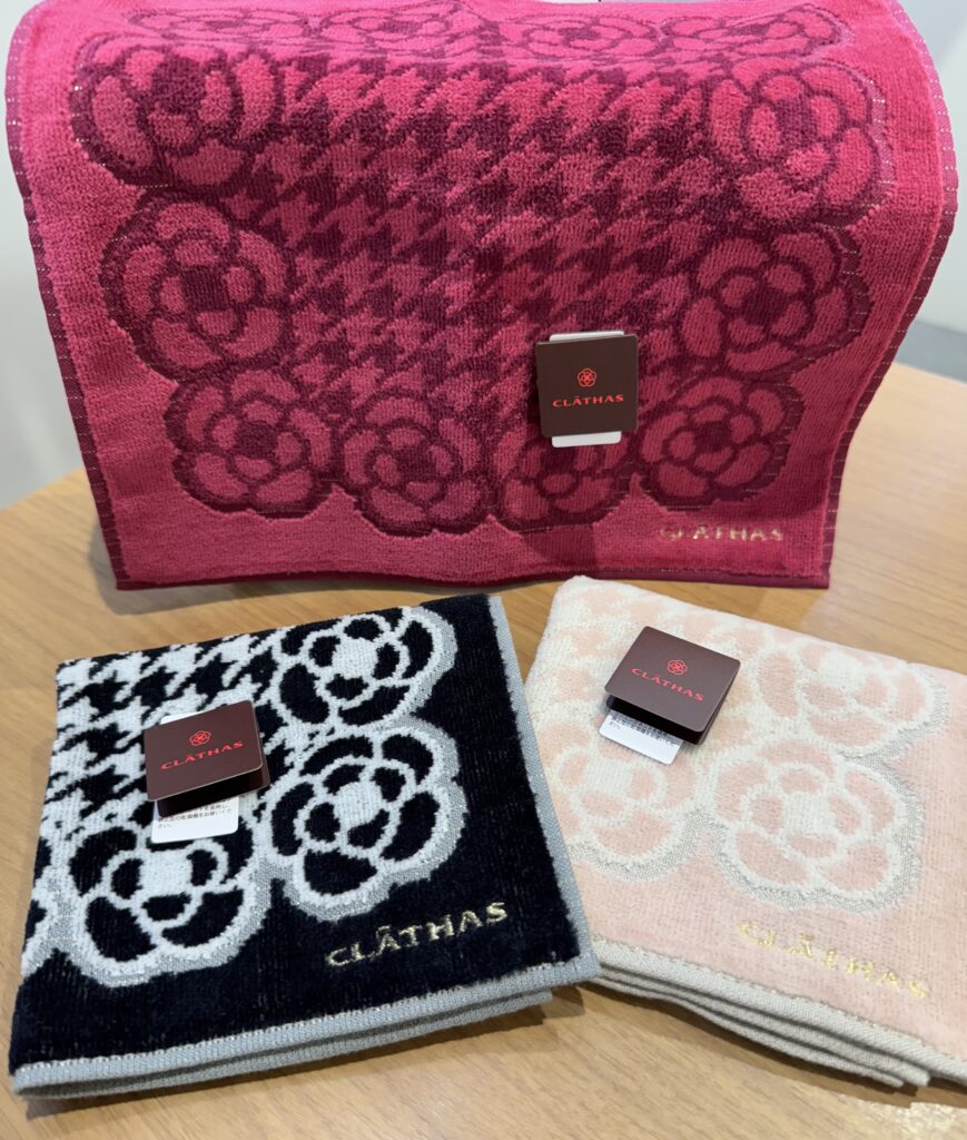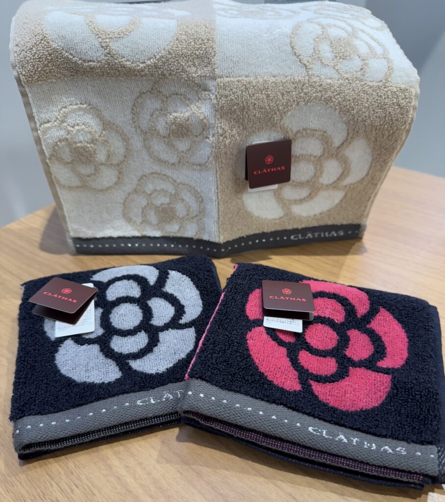 大きなカメリアを配したデザインで目を惹きながらシンプルカラーで上品なタオルハンカチです。