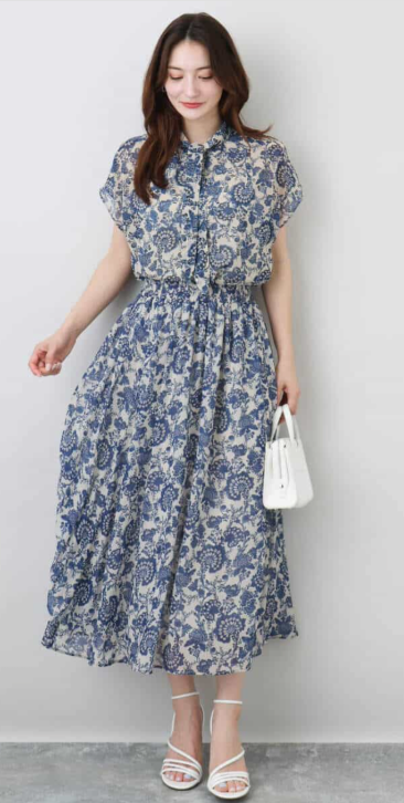 涼しげな印象の更紗模様のプリントシフォンブラウスはどちらを前にしても着こなせる前後2WAY仕様。スカートはウエストゴムでストレスフリーな着心地もうれしい