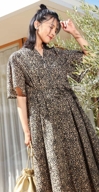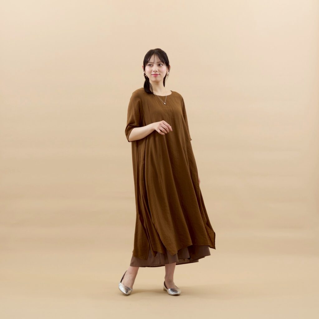 フレンチスリーブで気になる肩をカバーしつつ、すっきりとしたシルエットを実現します。
