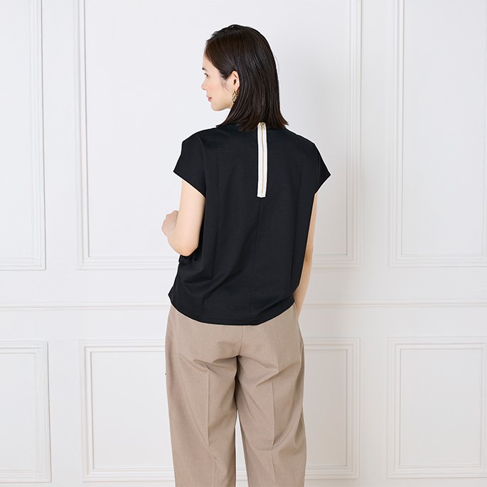 背中のジップはテープ部分を表側に使用し、モード感のあるアクセントを加えています。