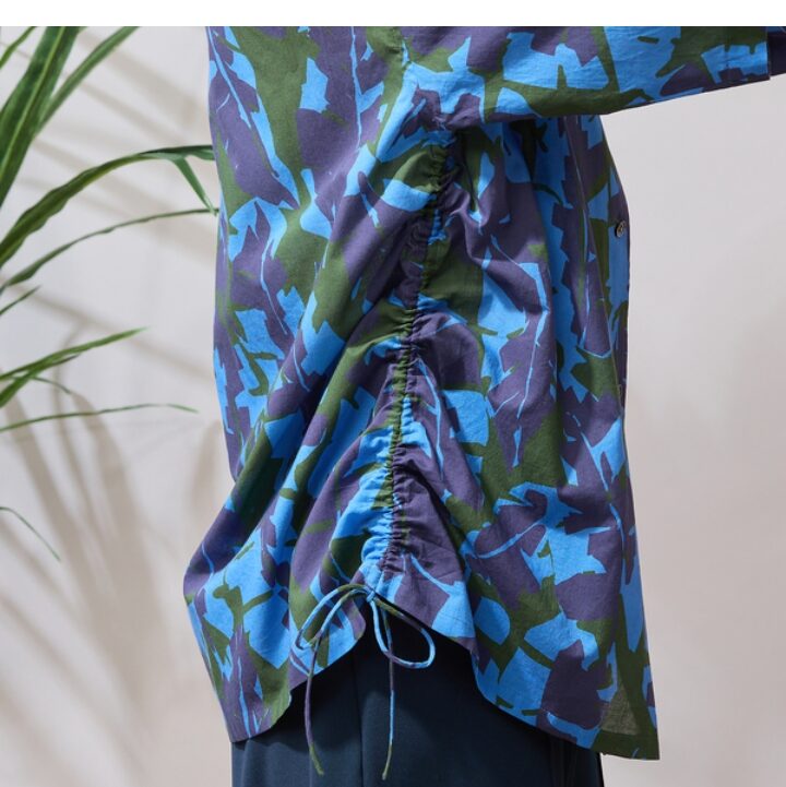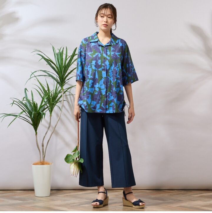 リーフ柄をイメージさせる幾何プリントブラウス。オープンカラーが開放的な印象です。こなれた大人アロハシャツで暑い夏を楽しみましょう!脇のドローコードで変化をつけてコーディネートのバランスを調整できます。白パンツやデニムに合わせて大人カジュアルなスタイルが楽しめます。