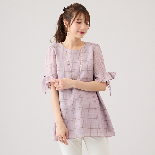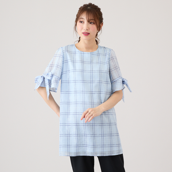 シアー素材にチェックが爽やかな夏のスタイルを作るブラウス。