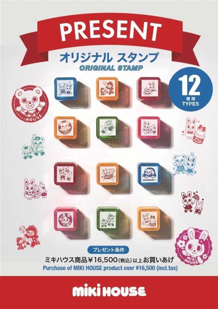 8月8日(金)~8月17日(日)期間中、16,500円(税込)以上お買上げのお客様に『ミキハウスオリジナルスタンプ』をおひとつプレゼントいたします。まだまだ続く暑い夏を快適に過ごしていただける機能的なアイテムを多数取り揃えております。ぜひこの機会にお立ち寄りくださいませ。※プレゼントはなくなり次第終了となります。