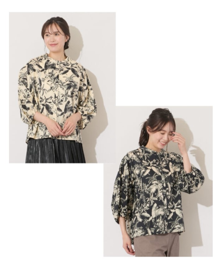 こちらは、バイカラーで描かれたボタニカルプリントのブラウス。ボリュームスリーブが今っぽくて大人かわいい1枚です。綿100%で着心地も快適。袖をキュッとたくし上げても◎。パンツでもスカートでも合わせやすい丈感で使いやすいアイテムです。