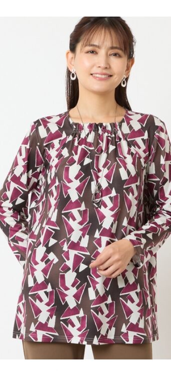 程よい肉感とストレッチ性のあるカットソーに、大胆な幾何柄をプリントしました。深みのある色合いで秋のお出かけにピッタリの一枚です。