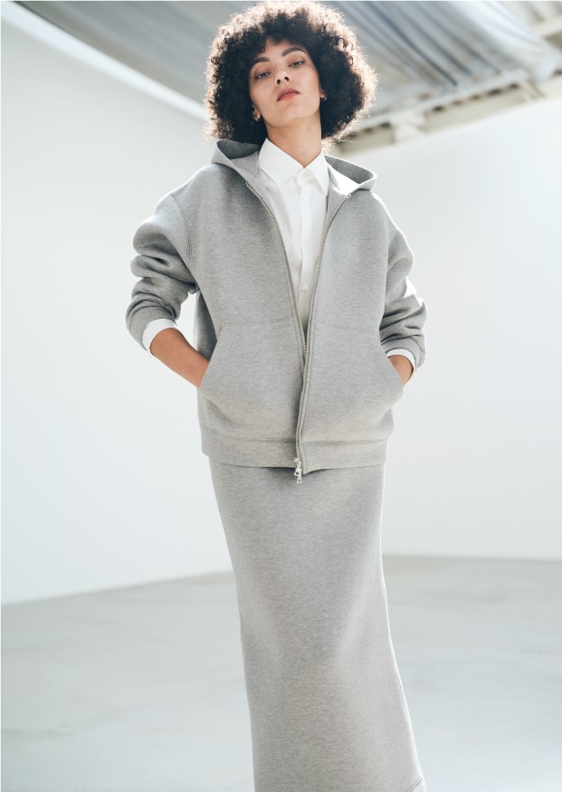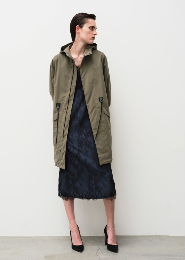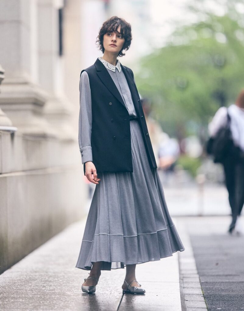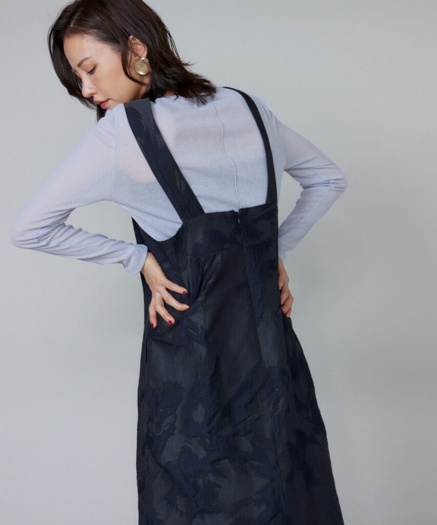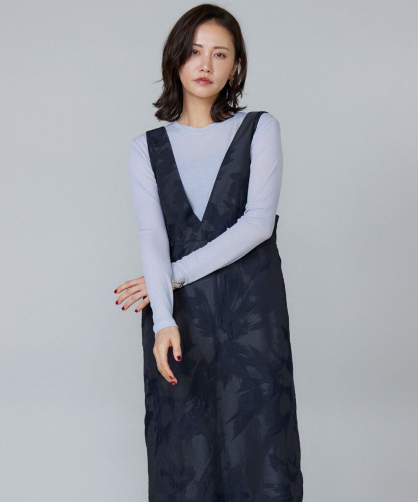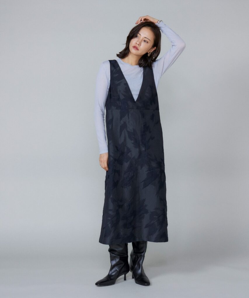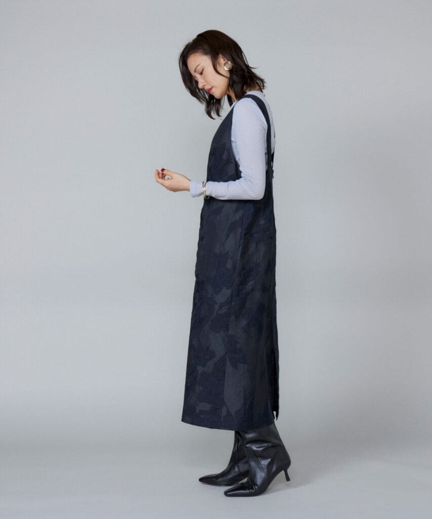 シアー素材やブラウス、ニットなど、インナーを変化させる事でシーズンレスなスタイリングが可能なジャンパードレスは、季節の変わり目に重宝する1着。高めの位置に施した切り替えや身体のラインを拾わないストンとしたストレートシルエット、モード感のある深めのVネックが細見えを叶えます。
