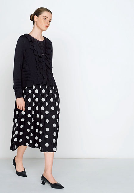 存在感たっぷりなドットをスカート部分に配したシャーリングジャーカードのドレスには、