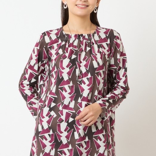 ・程よい肉感とストレッチ性のあるカットソーに、大胆な幾何柄をプリントしました。深みのある色合いで秋のお出かけにピッタリの一枚です。