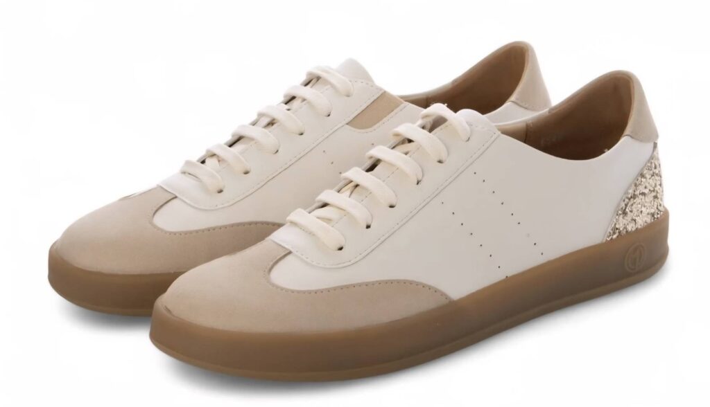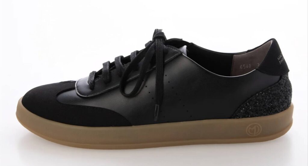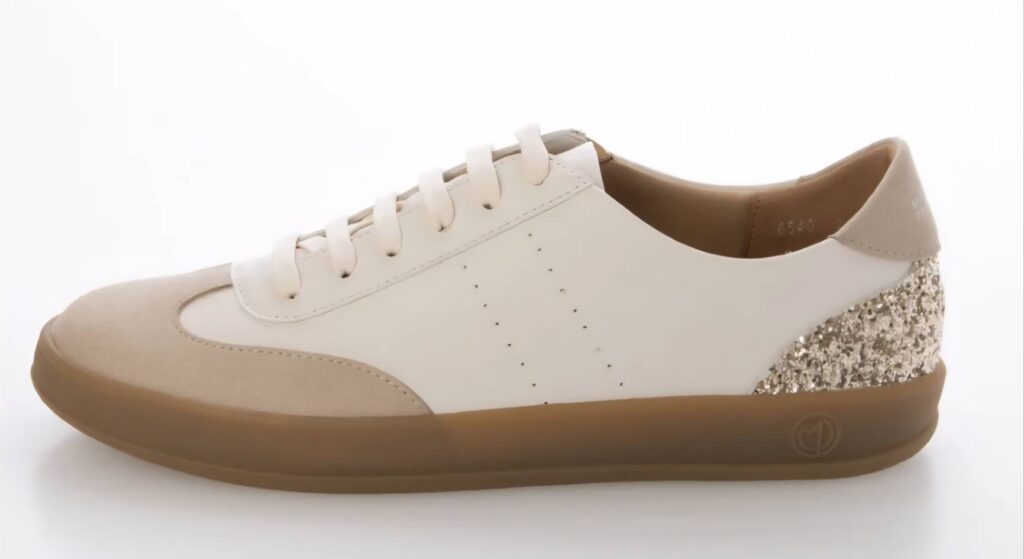かかとのグリッターデザインが目を引く、大人可愛いレースアップスニーカー。
