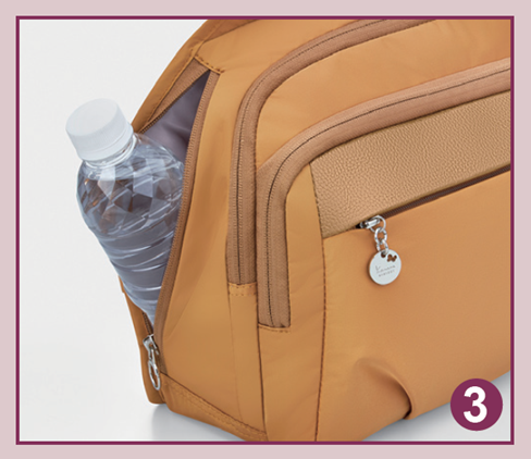 サイド部分のファスナーを開くと容量が増えるエキスパンド機能付き。