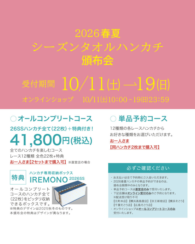 2026年春・夏タオルハンカチの単品予約ができるのは、頒布会期間中のみになります。