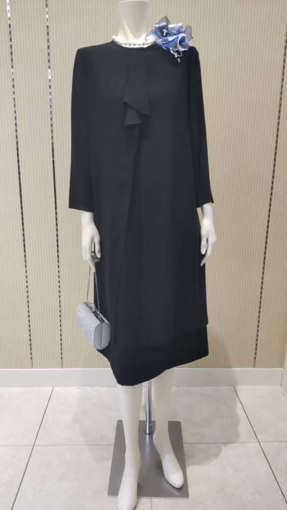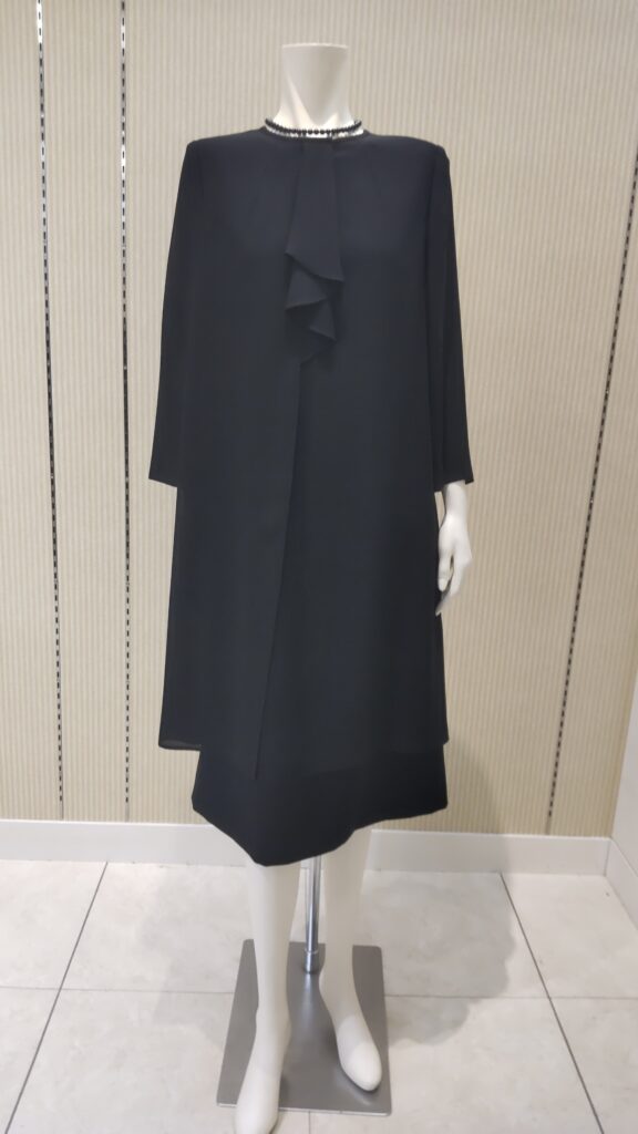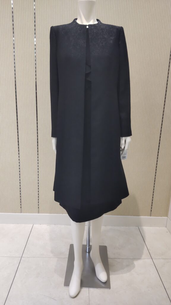 これから寒くなるシーズンにジャケットコートタイプのアンサンブル。お通や、お葬式にそのままご参列できます。中のワンピースはオールシーズン対応できます。結婚式にも、アクセサリーを付けてご着用になれます。