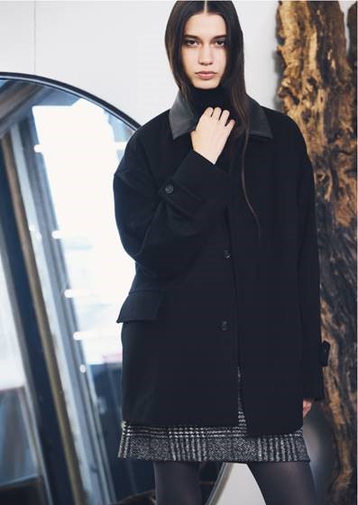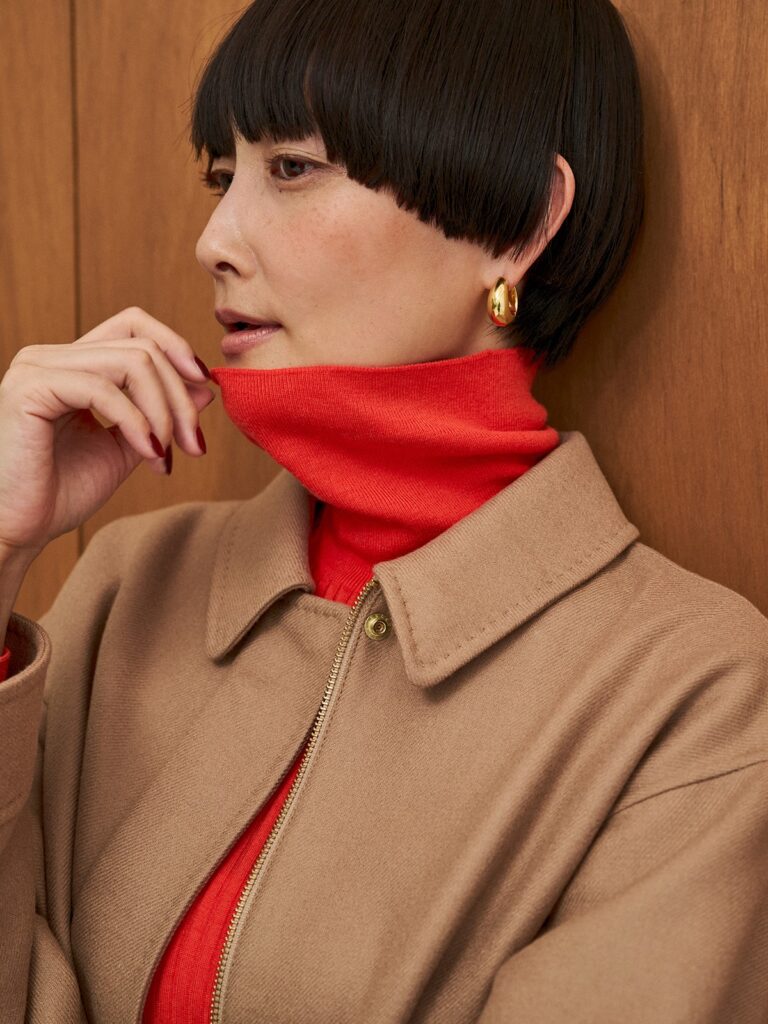 たっぷりとした分量感で包み込まれるような着心地のリラックス感のあるダウンコートは、フードを外すとスタンドカラ―になりシャープな印象です。