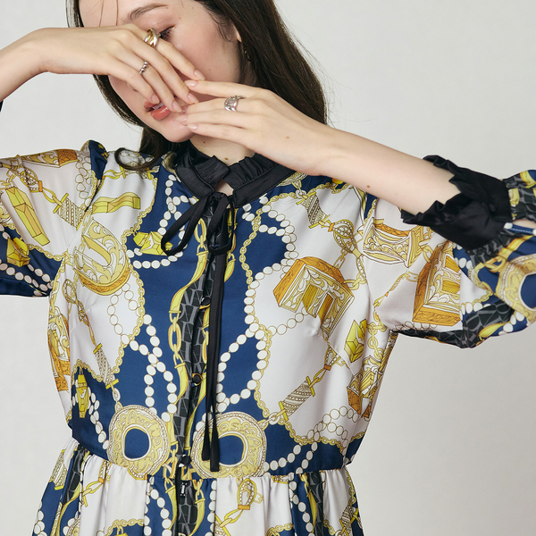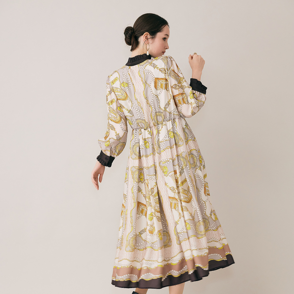 パールやAudie a Musesのイニシャルをモチーフにしたモダンなオリジナルのスカーフ風プリントワンピース。すっきりとした配色はよりクラシカルさに上品さがプラスされ大人の余裕が感じられるワンピース。大胆なプリントですが、細かなディテール使いが繊細で、1枚で着映える心ときめくアイテム。
