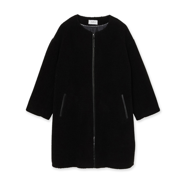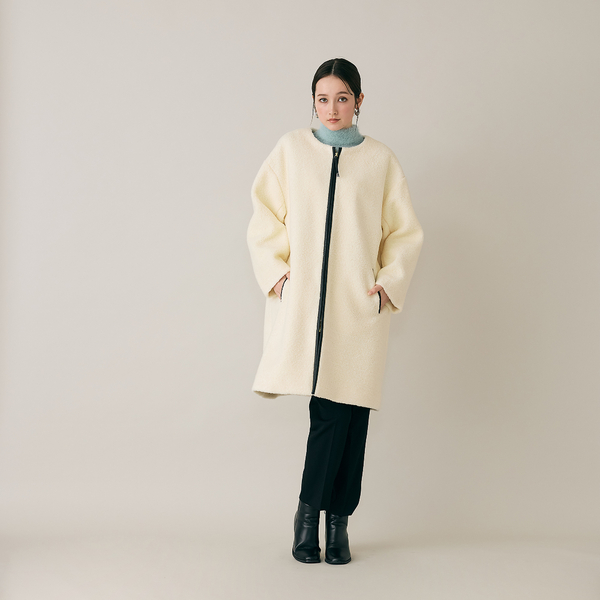 ロング丈のシンプルなボアコート。前端やポケット口に合皮テープをつけアクセントに。ノーカラーであまりボリューム感を感じさせないノーブルな印象に。できるだけデザインをそぎ落としクリーンに。ふわふわした素材を楽しむロングコート。