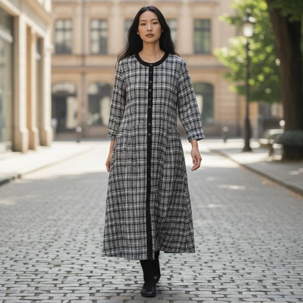 首周りとボタンホールの中央にラインがスッキリ入り、ポイントになっています。袖口は、春らしく軽く動きのある感じです。スッキリ見えて着やすさ抜群のワンピースです。