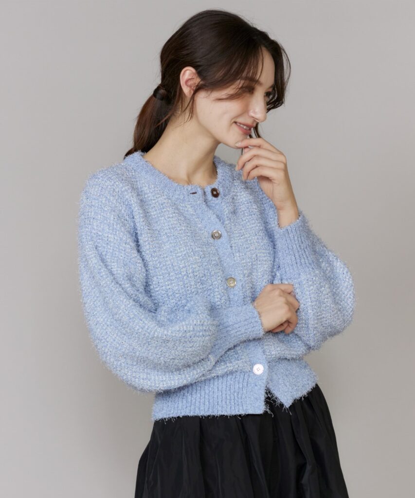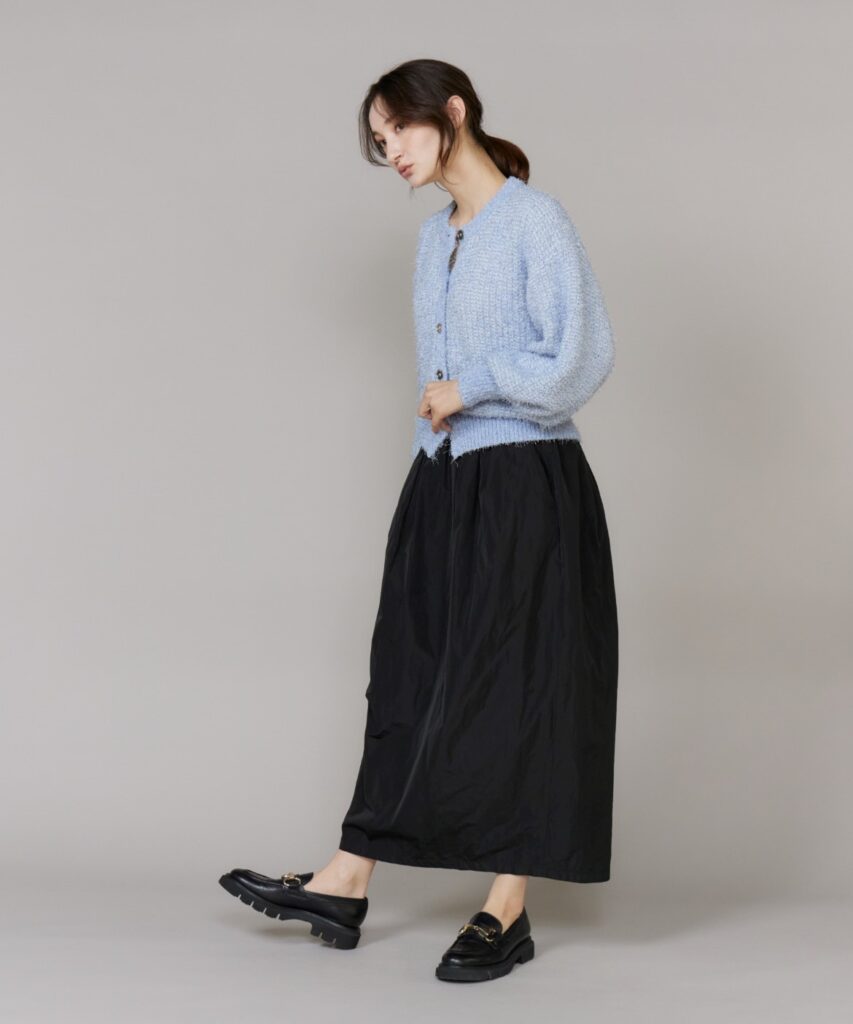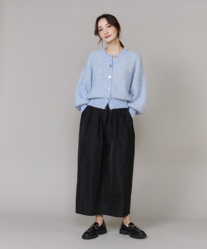 毛足の長い光沢感のあるフェザーヤーンを使用し、コンパクトな着丈とボリューム袖でメリハリのあるスタイルを実現。