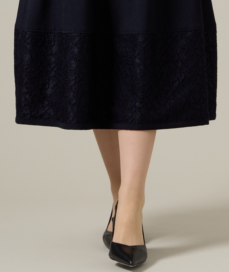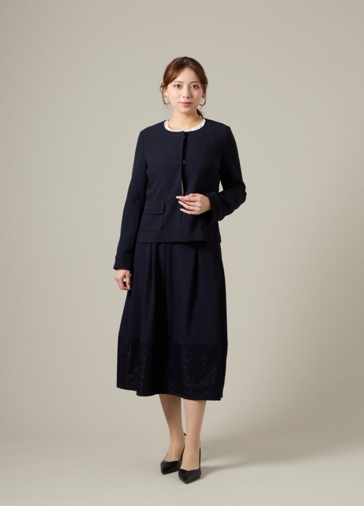 ストレッチの効いた着心地の良いジャケットに、裾にレースをあしらい、スカートの裾のラインがデザイン性のあるお作りです。フォーマルな装いの中に個性のひかるデザインです。
