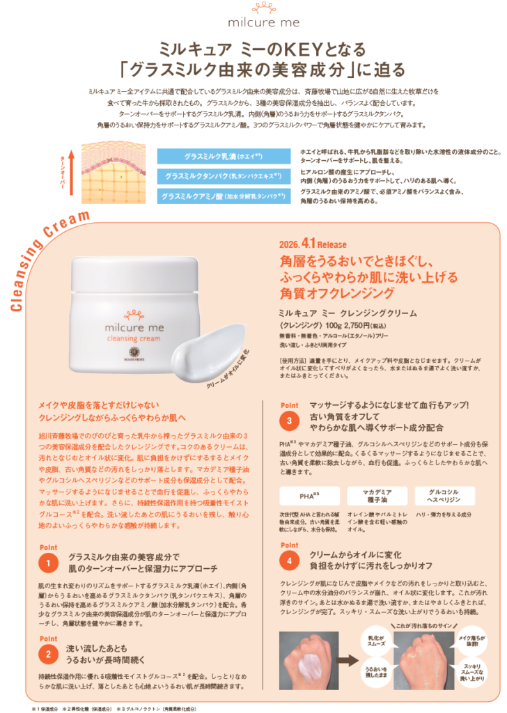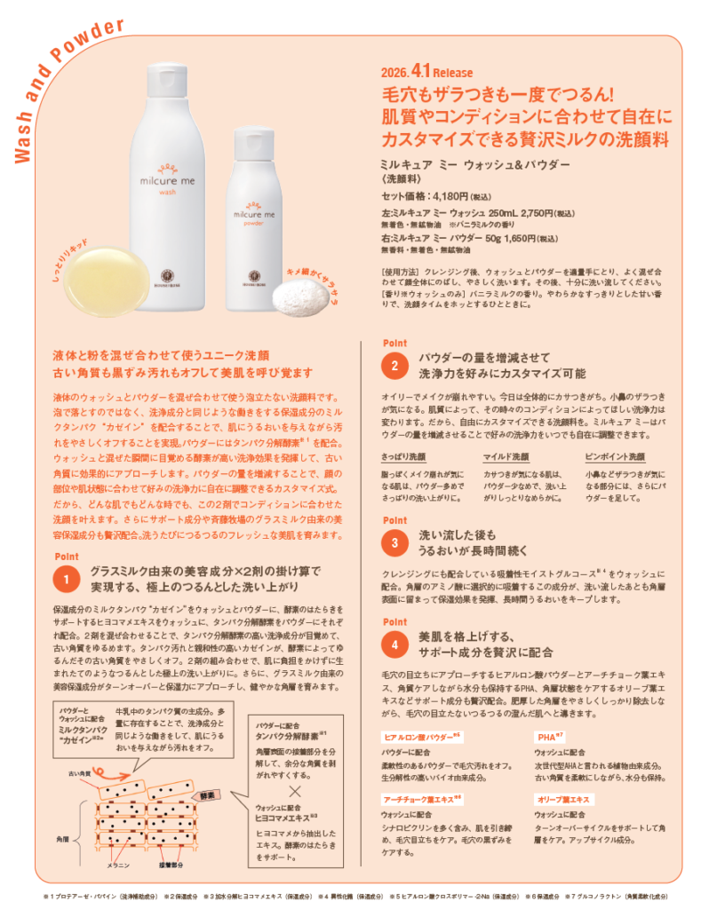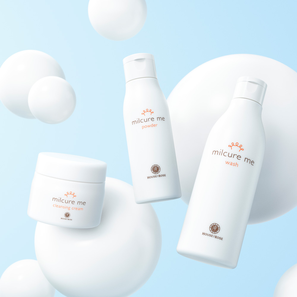 1980年に誕生したミルクパック&パウダースターが洗顔&角質ケアアイテムとしてヒットアイテムに。1986年にはハウス オブ ローゼ独自のお手元で体験いただく接客スタイル『ハンドウォッシュ』を確立し、ますます人気を伸ばしました。1988年にはスキンケアライン化し、ミルキュアが誕生。2001年、2008年にリニューアルし、ハウス オブ ローゼを代表するロングセラー製品に。そして、2026年春、新たにミルキュア ミーとして生まれ変わります。※1 グラスミルク乳清(ホエイ)・グラスミルクタンパク(乳タンパクエキス)・グラスミルクアミノ酸(加水分解乳タンパク)(保湿成分)