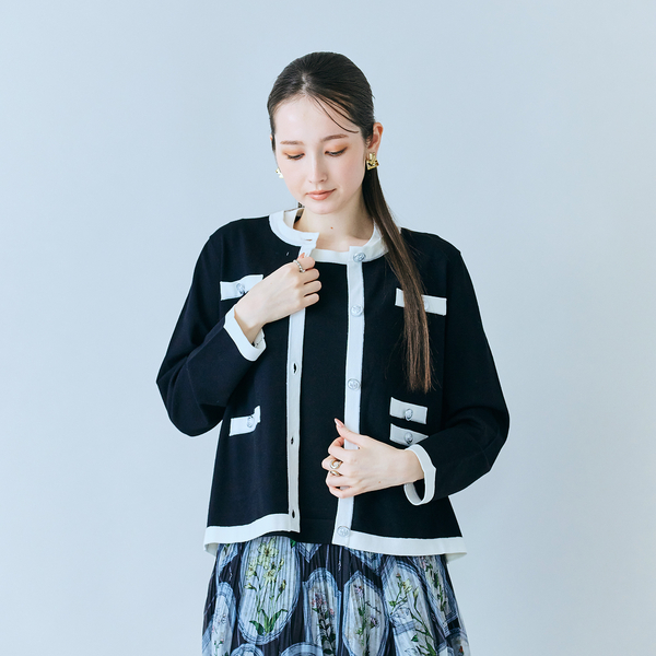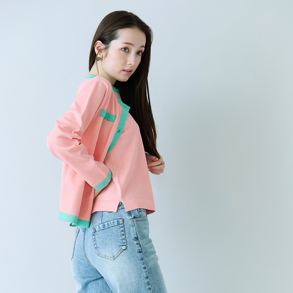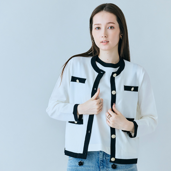 アクセントのバイカラーが目を惹くニットアンサンブル。インナー、カーディガンそれぞれ単品でもスタイリングでき、汎用性のあるアイテムです。フラットな編地でサラッと着こなしができ、キレイ見えが叶います!