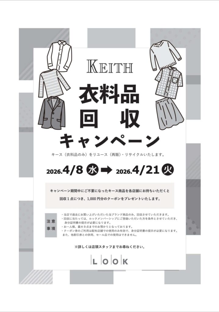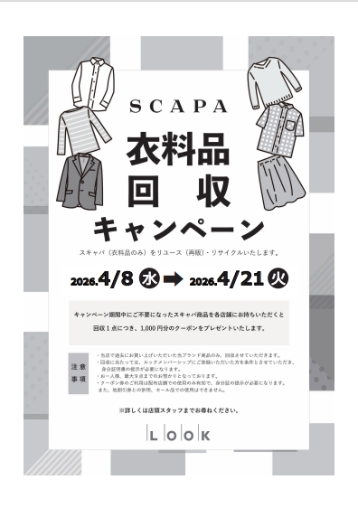 3階、スキャパ・キースでは、衣料品回収キャンペ-ンを実施中です。期間中にご不要になったスキャパ・キ-スの商品をショップへお持ちいただくと、回収1点につき1000円分のクーポンをプレゼントいたします。