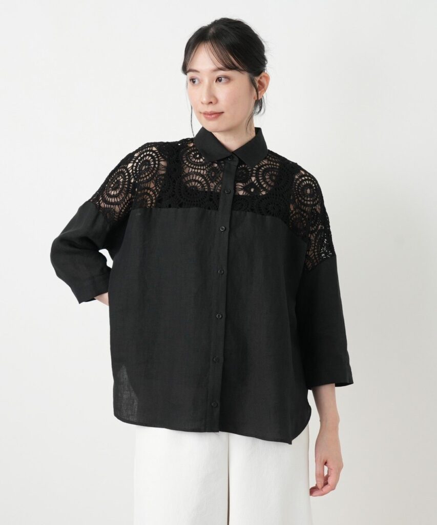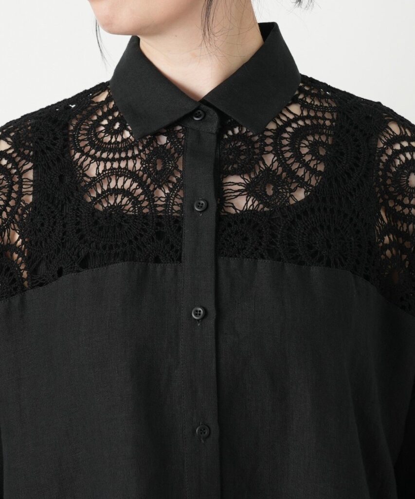 イタリア製生地を使用した上品な麻のシャツです。前身頃と肩部分に施されたマクラメ調レースが特長のデザインです。シルエットはドロップショルダーでリラックス感があり、麻特有の清涼感とナチュラルな風合いが、実用性と心地よさを両立させています。