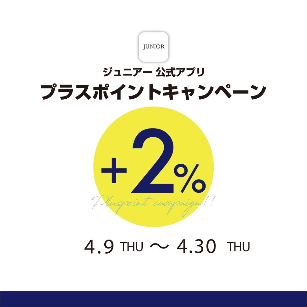 上記期間中、オーディアミューズ・ローズティアラで定価商品をお求めいただくと、JUNIORアプリメンバーズのポイントが2%プラスになる、プラスポイントキャンペーンを開催中!(当日の新規ご登録のお客様も対象です)