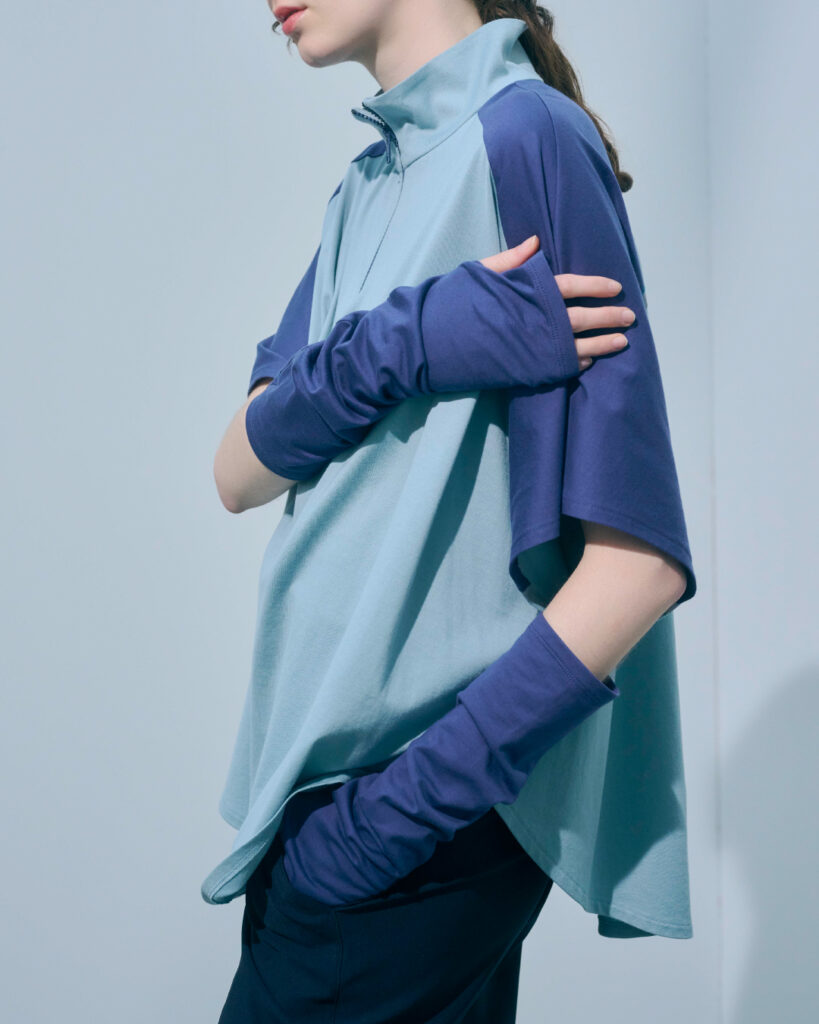 気温に合わせて着脱できるアームカバー付きハーフジッププルオーバー。ヨーク部分とファスナーの色味を合わせ、統一感が出るようにしています。背面の反射テープの上を走るサイクリングワッペンと、同系色のツヤのあるロゴプリントが、遊び心のあるポイントに。風をはらむゆったりとしたシルエットで、軽やかで心地よく着用出来ます。