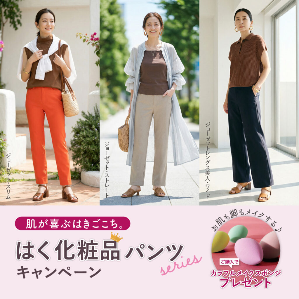 対象商品購入でノベルティプレゼントのキャンペーン開催中!春のお出かけにピッタリなビースリーの定番所品「ジョーゼットシリーズ」。是非店頭にてご試着いただき、ビースリーのストレッチパンツをご体感ください。